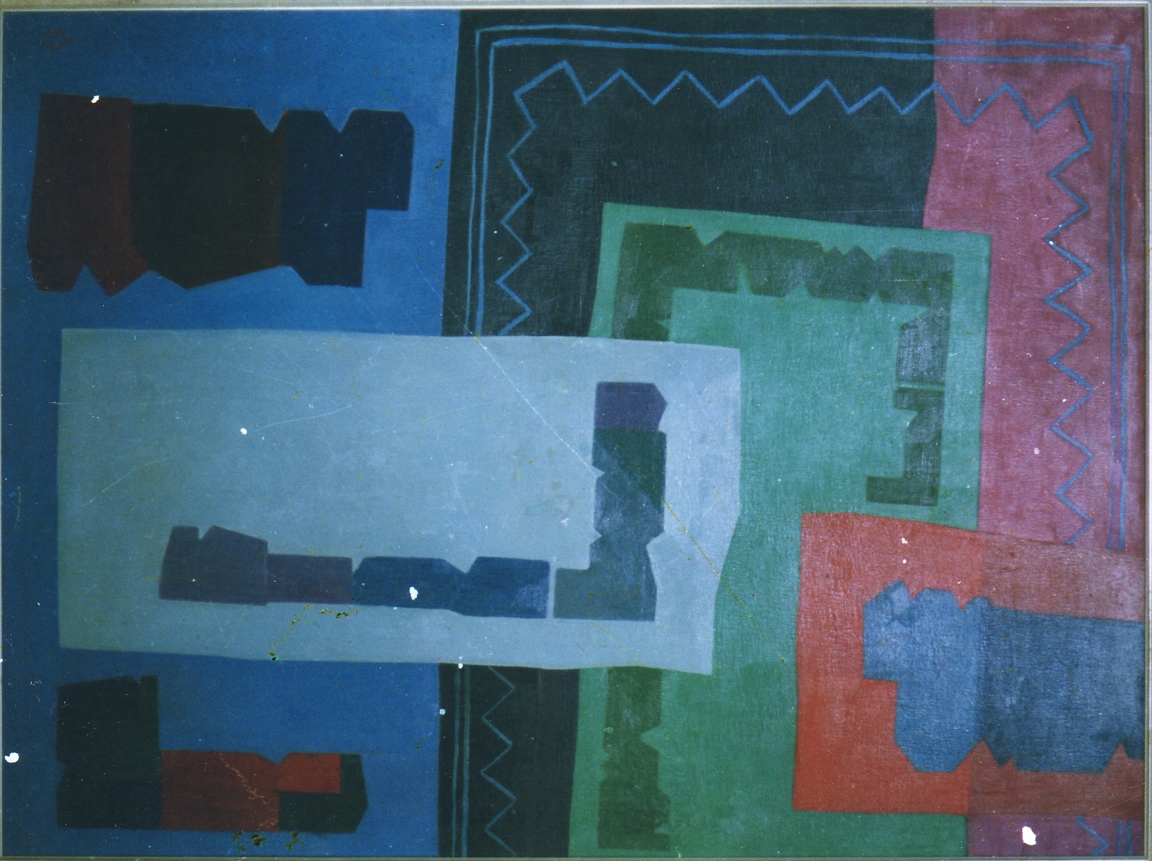 This oil on canvas by Faraj Abbu brings together a conglomeration of colors and shapes that overlap and converge. The blue zigzag pattern overtakes the canvas as the most jarring repetitive shape used. The remainder of the composition is formed out of soft rectangular patches of blue, red, and green. Different shades of color pervade these patches creating a top layer of recurring forms.