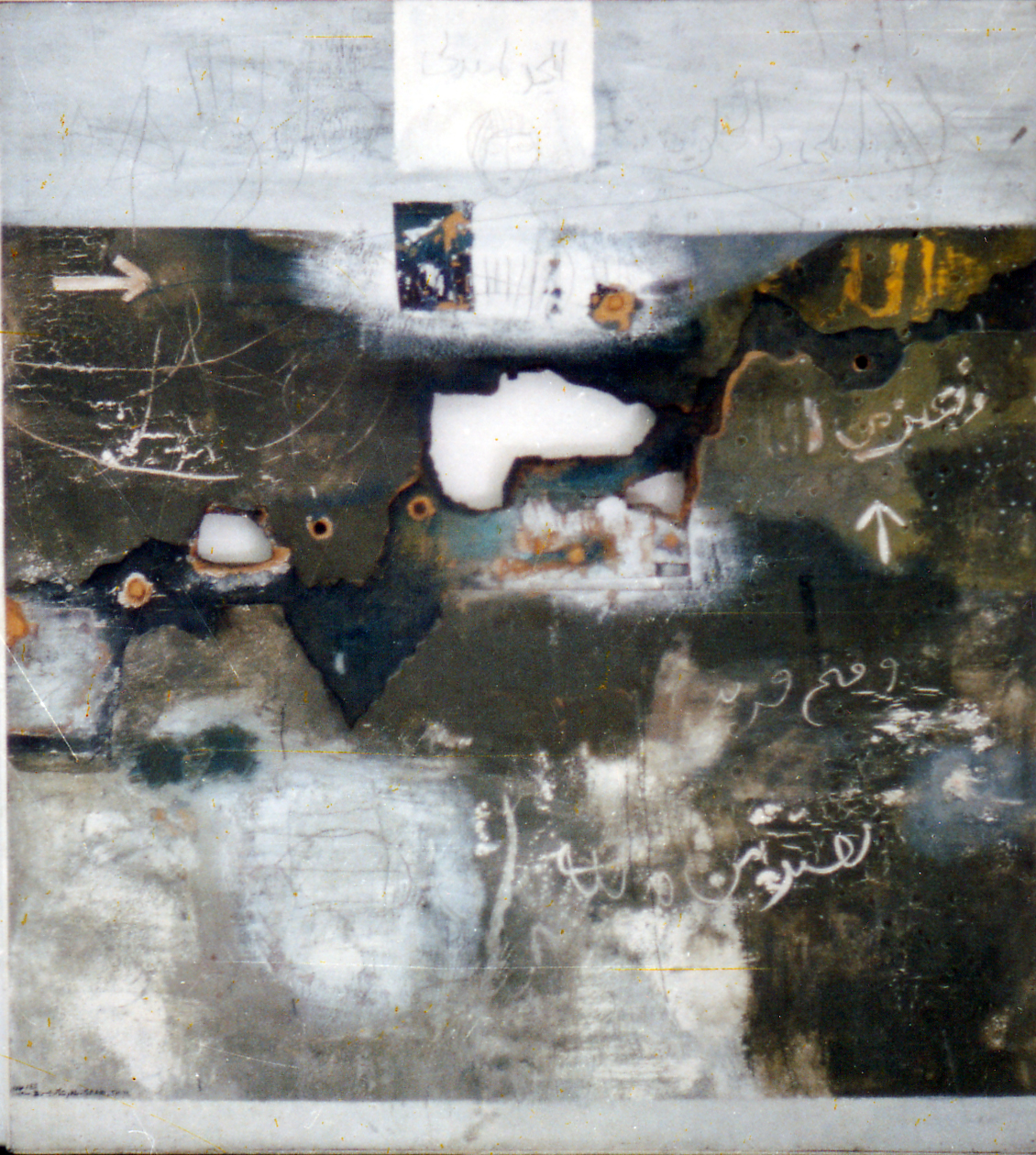 In this abstracted composition, by Shakir Hassan Al Said, script appears throughout the blackened and washed out surface. Two arrows on either side of the composition direct the viewer’s eye over and up, while the writing fades in and out of the background. An uneven application of black and white is supplemented through the use of scattered oranges and blues. A jagged form cutting horizontally across the picture plane contains within it holes of various sizes.