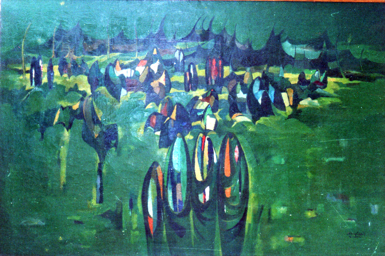 Again, the figures in this composition, by Ismail al Shaikhly, are abstractly rendered through the use of reductive garmenting. The oval humanoid forms are scattered throughout a deep green background. Some stand erect while others bend low gathered around a central activity. Behind them sits a series of black upright triangular forms resembling tent structures.