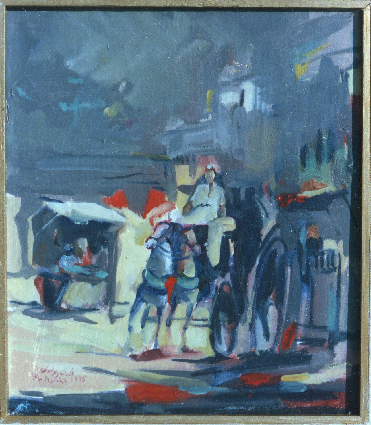 Mahdi Al-Asadi has rendered this scene in a painterly manner as the subject matter is articulated with swaths of color rather than with detail. Although visual specificity is not the priority with this representation, figures can be identified and subject matter inferred. Central to this composition is a horse and carriage pair seemingly in motion. In the middle ground a market stall stands open complimenting the background of implied buildings.