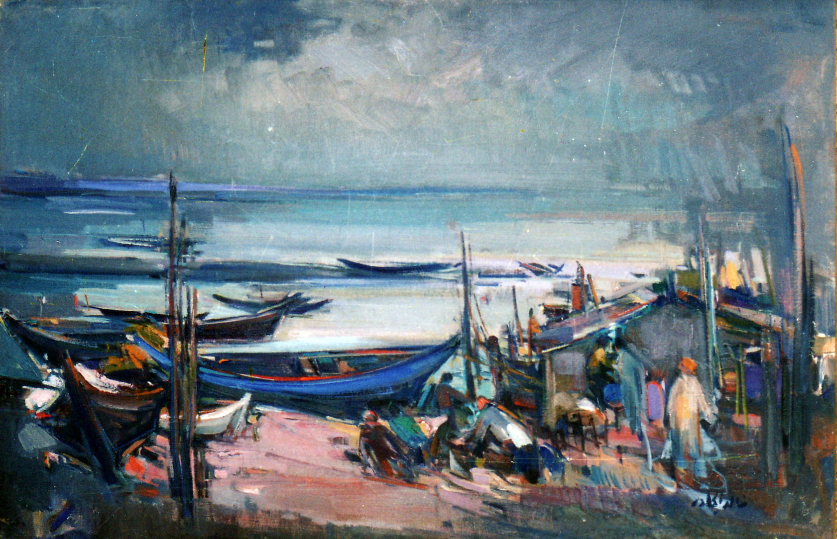 Where as the previous work "Women in the Village Souq" shows the daily tasks of the females in the village, "River Scene 1" illustrates the tasks that the men of the village undertake daily. The scene depicts the readying of the vessels to go out onto the water to catch the days bounty of fish. The colors used by Al-Jadar in this painting are rich pigmentation of blues, purples, and beige with the punctuations of crimson and orange. The striking and flowing lines add to the feeling of movement and water in the piece.