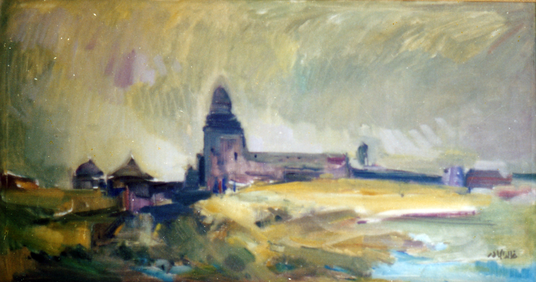 The landscape depicted here is somewhat more ambiguous than that of others painted by Al-Jadar. The colors are rich and saturated and references the changing light at the end of the day. The architecture scene in the distance resides in a focus that is slightly blurred. The overall effect is one of pastoral onlooker viewing the city in the distance.