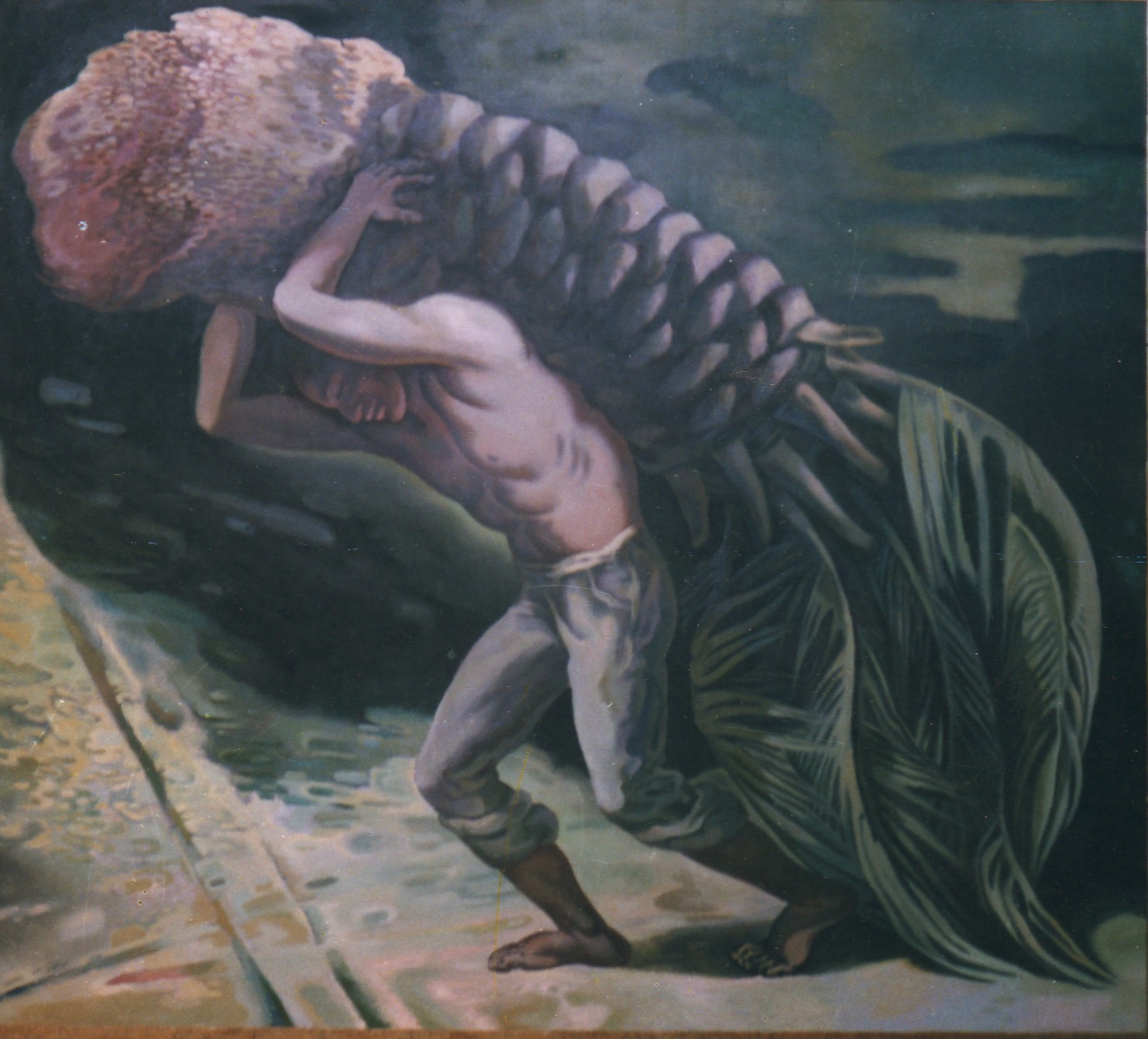 The main figure in this painting, by Mahoud Ahmad, is a lean yet muscular man, clothed simply in rolled trousers, carrying an uprooted palm tree on his back. The man’s facial expression is not one of strain despite the supposed effort of baring such a weight up a slight incline. The background of the piece is non-descript being composed of blackish smears and gives little indication to the viewer of the setting in which this man labors.