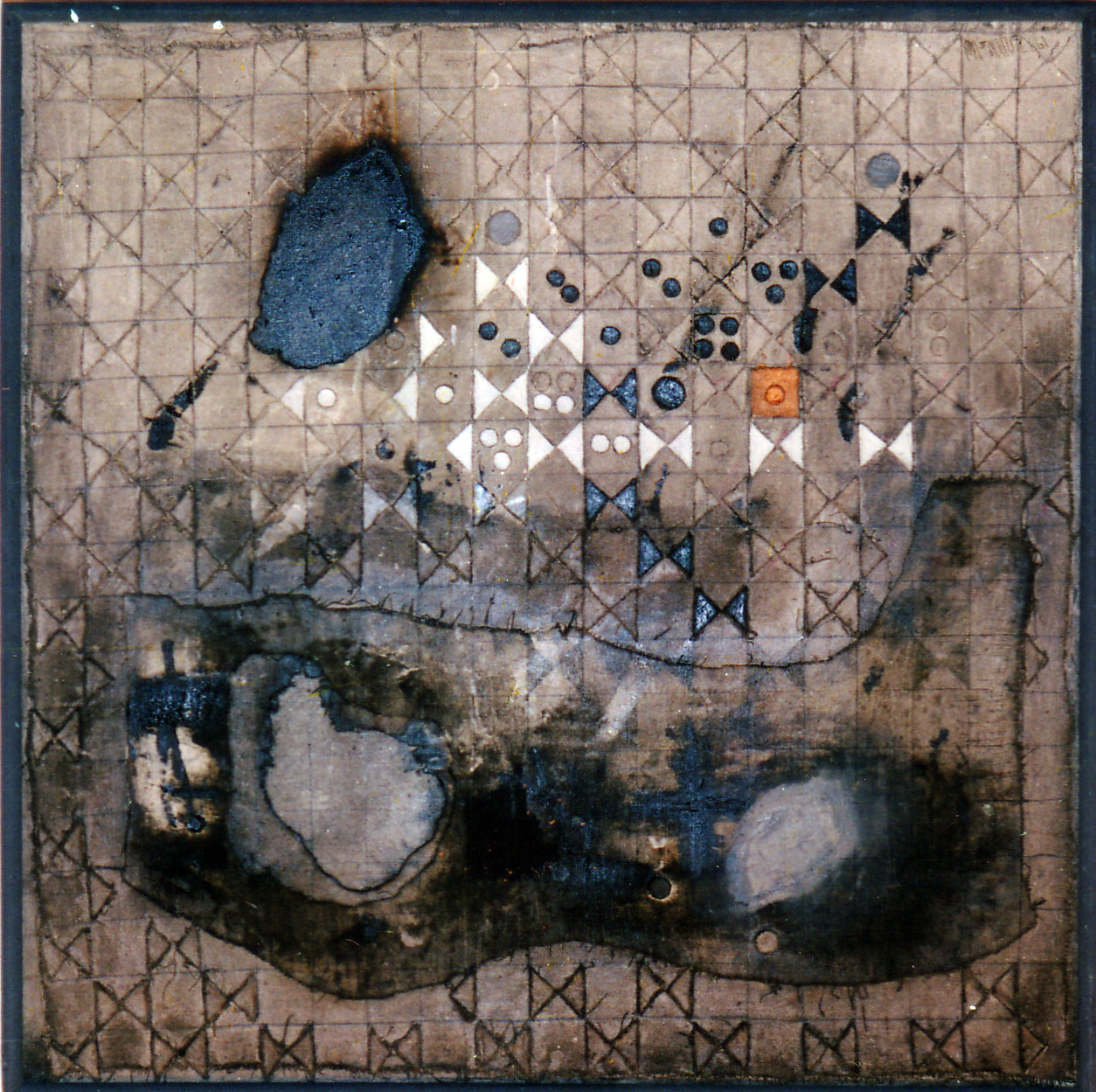 The entirety of this composition is made up of a grid-like pattern with small squares of the same size alternating between empty and containing an X shape or small circular shapes. With the exception of an orange square, the color palette is neutral with black, tan, and white. Throughout the picture plane there exists striking burn marks indicated by blacked swaths of singed material.
