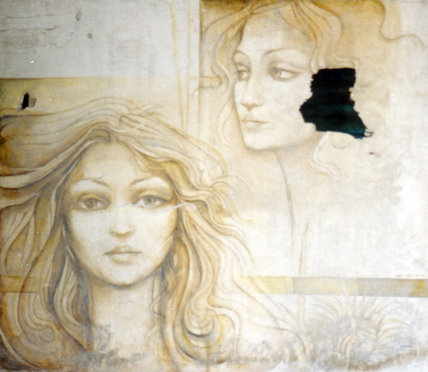 This surreal portrait, by Suad al Attar, focuses on the visage of a young woman from both a frontal and three-quarter vantage point. The figure is rendered through the use of outline and shading. Undulating lines flow outward from the woman’s face giving movement to the hair. On the ground plane of the composition a faded flower is seen with its pedals budding outwards. The color scheme of the piece is monochromatic centering on varying yellow tonalities.